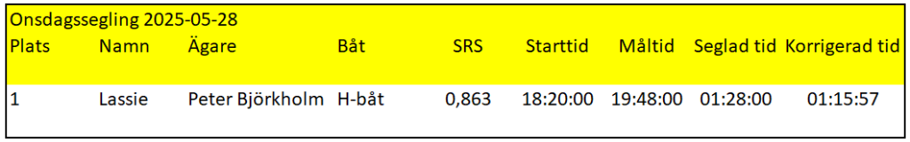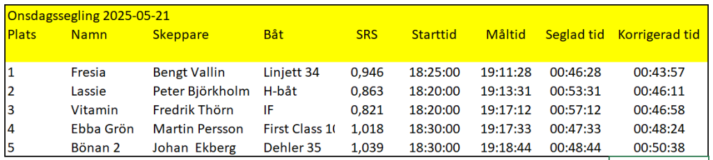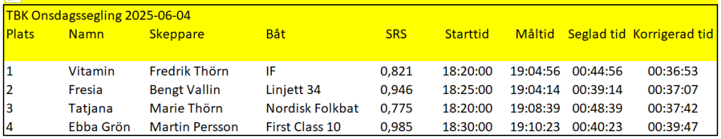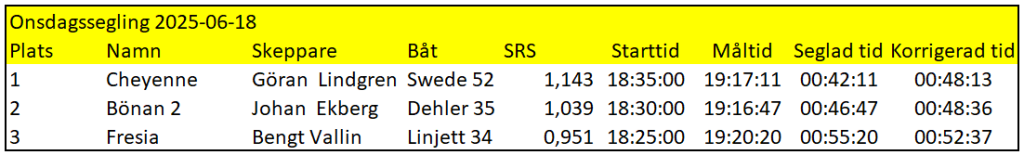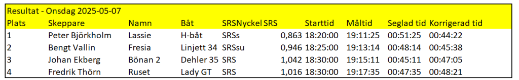 Som vanligt denna vår var vindarna opålitliga även denna onsdag, varierande i både riktning och styrka. I övrigt fina förhållanden med värme, inget regn och snabb segling. Sekundstrid mellan de tre första båtarna, med Vitamin som segrare.