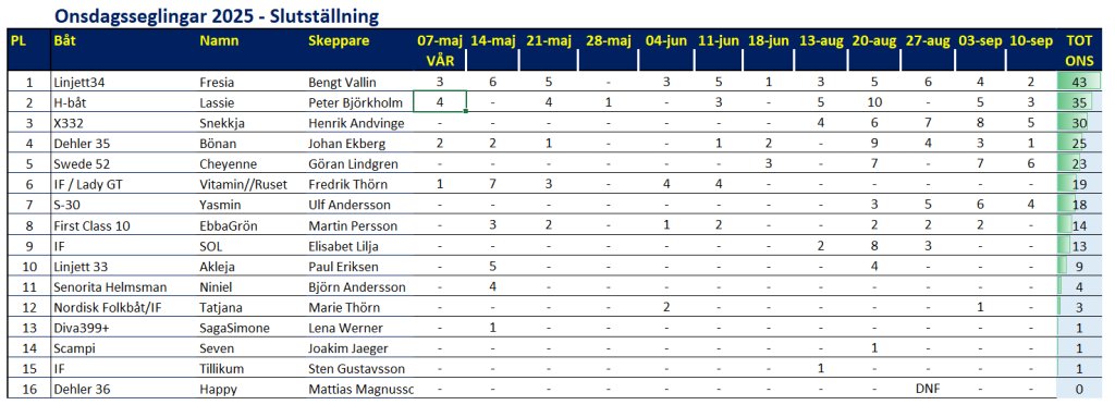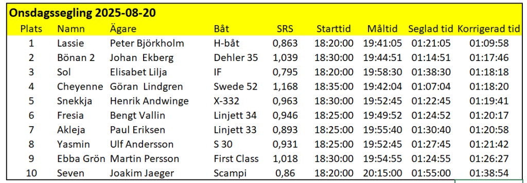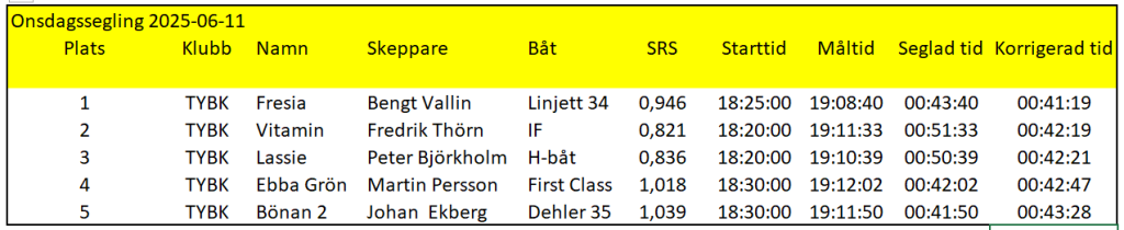 Inget sommarväder heller denna Onsdagssegling, grått, byigt och givetvis en rejäl regnskur. Trots detta fin segling och nyttig träning. Dagens sekundstrid var mellan tvåan och trean, Vitamin och Lassie då det skiljde två sekunder på omräknad tid till Vitamins fördel. Bäst för dagen gick Fresia.