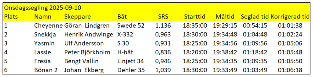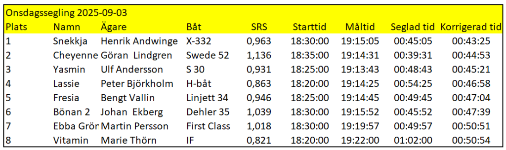 Fint väder och svaga sydliga vindar, perfekta förhållanden för en onsdagssegling. Så när som på en båt kom alla i mål i allt svagare vind. Snabbast denna kväll var Henrik med besättning, som med sin genua fick fart på Snekkja. Grattis till segern!! Ett stort tack till Johan som fixade korv med bröd och tillbehör.